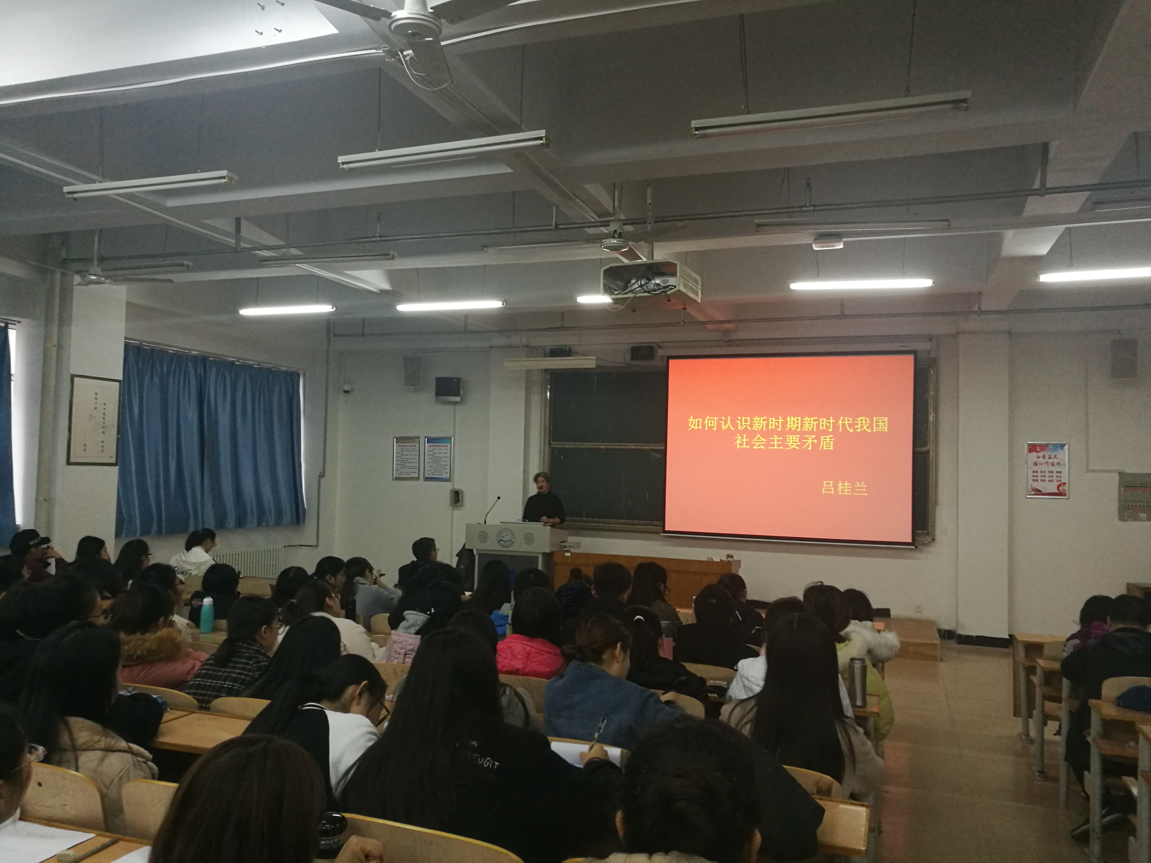 吕桂兰老师以如何认识新时期新时代我国社会主要矛盾为主题,从寻找道路、目标任务和历史使命等方面深入浅出的分析了新时期与新时代的区别;运用矛盾分析法深刻阐述了新时期新时代我国社会主要矛盾的具体体现;深刻解读了党的十九大报告提出的新时代我国社会主要矛盾已经转化为人民日益增长的美好生活需要和不平衡不充分的发展之间的矛盾,这一重大判断的现实意义;最后,吕桂兰老师勉励beat365大学生要结合自身的学科优势,在互联网+、大数据、人工智能科技高速发展的时代背景下,抢抓机遇、迎接挑战,将创新精神融入未来朝阳产业中,改善行业发展不平衡不充分的现状,为实现人民对美好生活的向往而努力奋斗,把报效祖国、造福人民、建功立业作为自己人生的崇高理想。