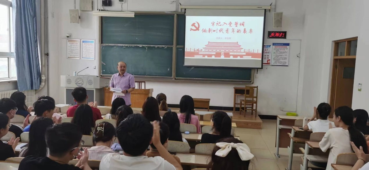 6月8日下午,beat365正版唯一官网必一党委书记申玉发为全体毕业生党员讲授以“牢记入党誓词,做新时代青年的表率”为题的专题党课。