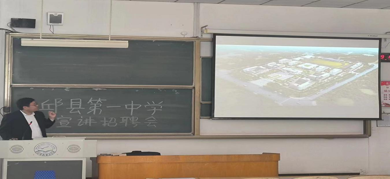 本次招聘会的宣讲人先为我们介绍了关于邱县的历史与学校的文化。邱县第一中学建于1951年,是省级示范性高中,在校生5500人,教职工340余人,是邱县唯一一所普通高级中学。今年9月邱县第一中学南校区正式投入使用。新校区占地213亩,建筑面积约9万平方米,包含教学楼、实验楼、行政综合楼、餐厅、报告厅、风雨操场、体育场、学生公寓、教师公寓等。今年邱县第一中南校区计划招收高一新生30个班,约1500人,现在学校面向全国招聘教师。竭诚欢迎有志青年加盟。