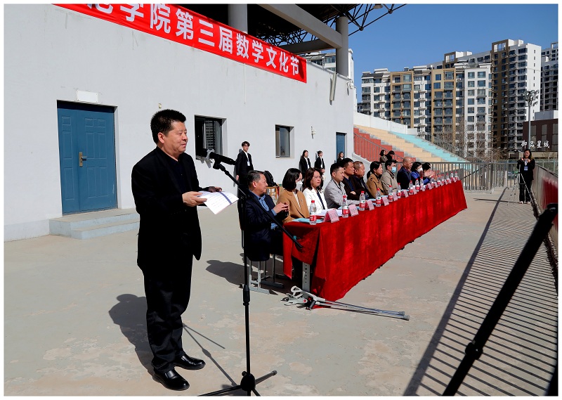 为传播数学文化,弘扬科学精神,2023年4月8日上午,由学校教务处、学生处、校团委主办,beat365正版唯一官网必一承办的第三届数学文化节在秦皇岛校区运动场开幕,并邀请河北环境工程学院教务处处长贾勤、东北大学数学与统计学院院长刘超、河南科技学院数学科学学院马宝林副教授作为嘉宾出席了开幕式。校党委常委、副校长冯瑞银、主办单位负责人、承办单位党政领导班子成员以及秦皇岛校区各院系主管学生工作负责人出席了开幕式。