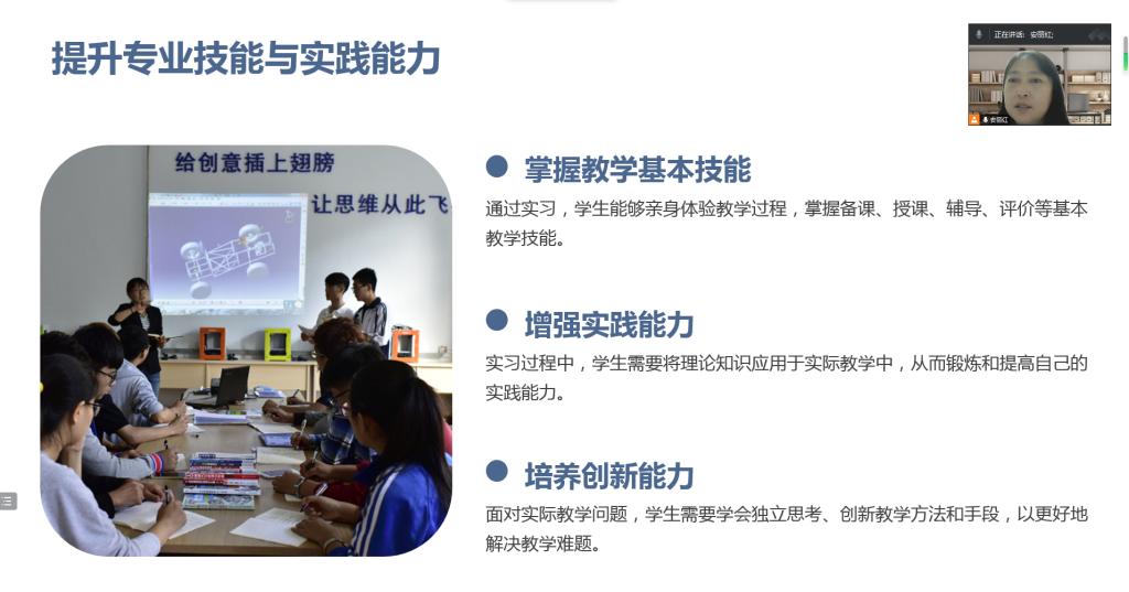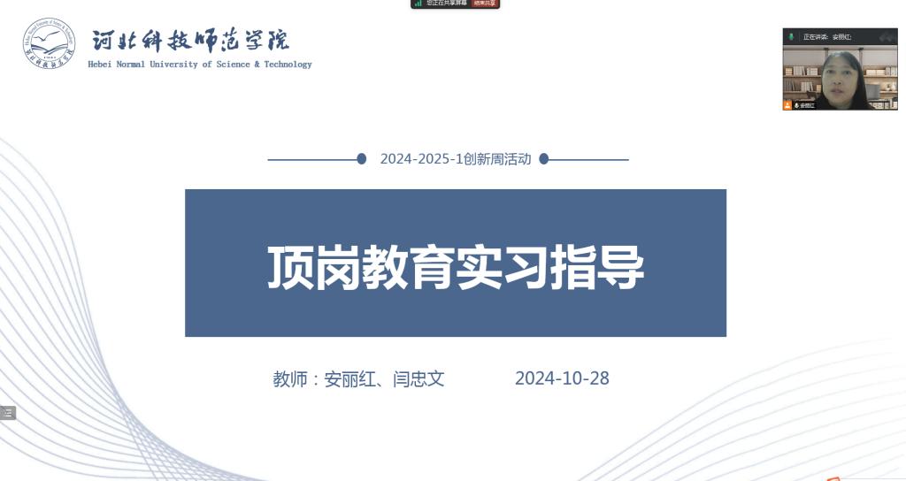 教育实习指导是顶岗教育实习进行指导,涉及到的是22级2201-03班学生,原定于创新创业周(第9周)周一(2024年10月21日)上午在X207进行,但由于22级学生参加军训,改为第10周周一(2024年10月28日)线上进行。